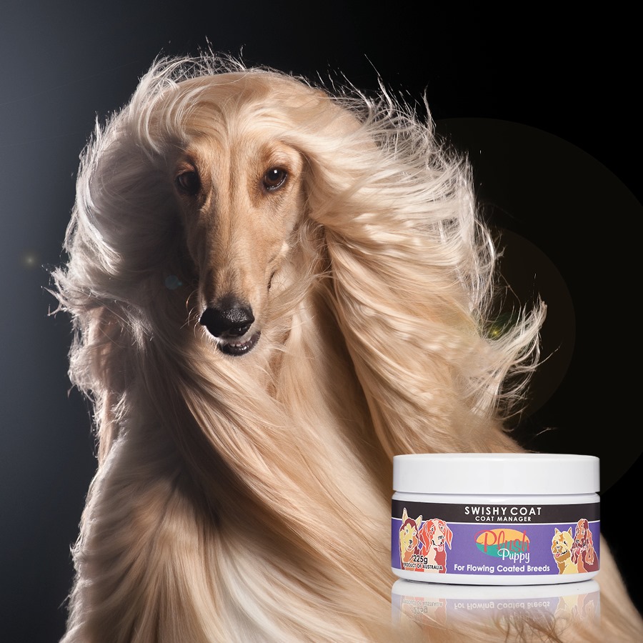 Keďže človek ako vlastník afgánskeho chrta už isto vyskúšal mnohé výrobky, mal by kvôli docieleniu dobrého efektu dostať srsť do pôvodného stavu pomocou Plush Puppy Deep Cleansing Shampoo v pomere 5:1. Alfou a omegou tejto srsti je, že srsť sa má kĺzať bez toho, aby sa lepila. Každý vlas by mal pôsobiť ľahko a individuálne. Srsť by nikdy nemala pôsobiť mastne alebo ťažko. Plush Puppy Protein Coat Balm nanesený od prostriedku vlasov až po končeky dodá srsti v deň výstavy nepatrnú váhu a spraví z krásneho dokonalé realitu.