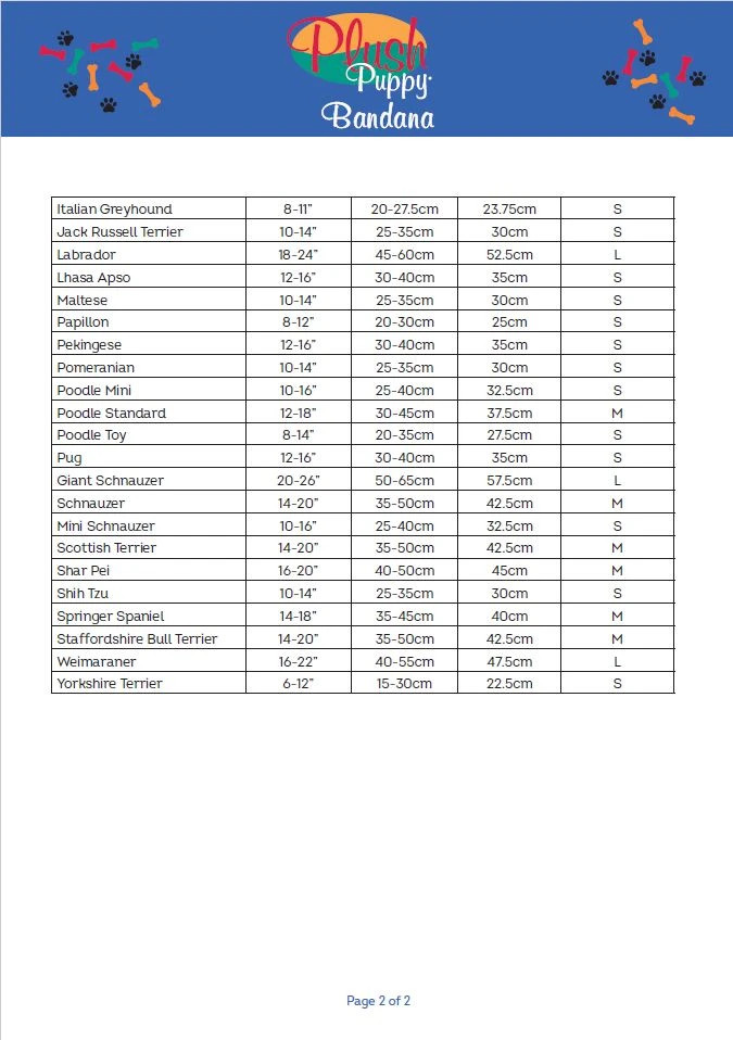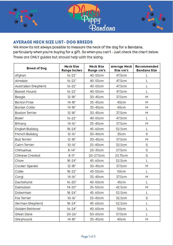 To je ideální, pokud kupujete bandanu jako dárek pro přítele! Můžete také použít naši doporučenou tabulku průměrných velikostí krku jako vodítko pro průměrné velikosti plemen.